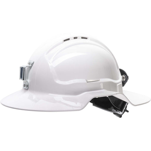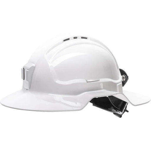 Maxisafe White Broadbrim hard hat with plastic miners bracket / rear lead strap - HBB57RH-PLV-WH