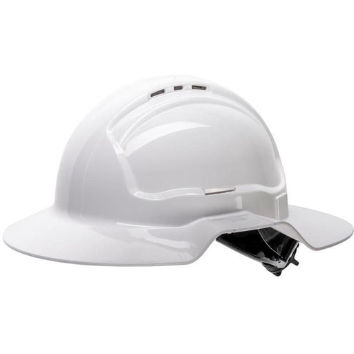 Maxisafe White Broad Brim Vented Hard Hat - Ratchet Harness This new design includes greater protection from the elements including a 60% increase ...