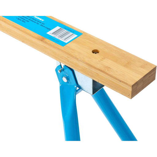 OX ToolsDurable and sturdy saw horse set Solid timber benchtop 800mm length 200kg load capacity 750 mm High Lockable legs Locking pin Quantity: ;2pcs set
